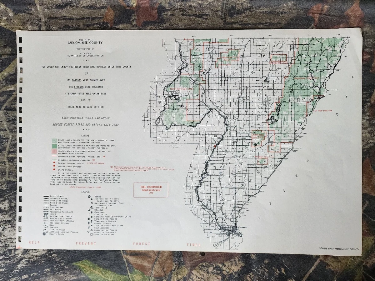 1955 South Half Menominee County Michigan Dept Conservation Plat